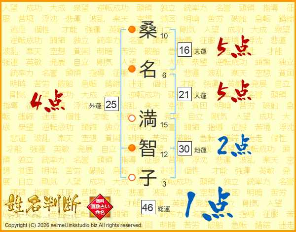 桑(10画)名(6画) 満(15画)智(12画)子(3画)