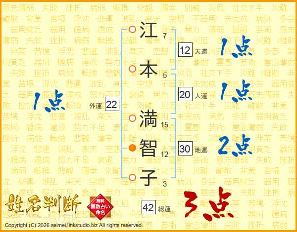 江(7画)本(5画) 満(15画)智(12画)子(3画)