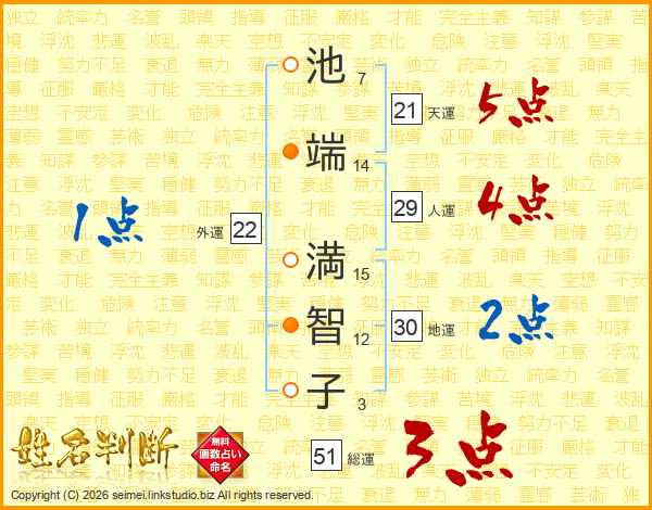 池(7画)端(14画) 満(15画)智(12画)子(3画)