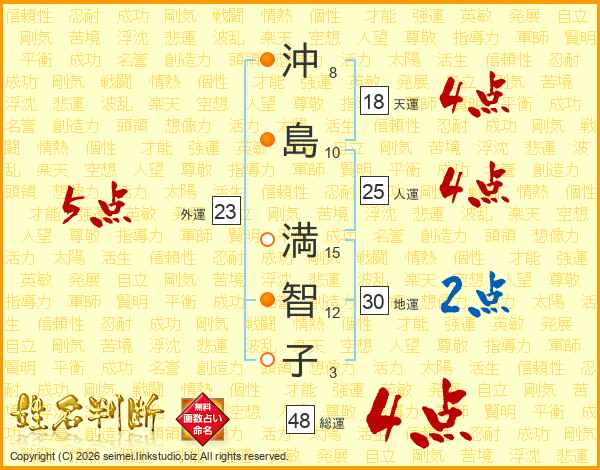 沖(8画)島(10画) 満(15画)智(12画)子(3画)