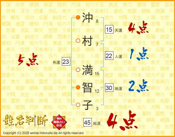 沖(8画)村(7画) 満(15画)智(12画)子(3画)