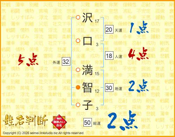 沢(17画)口(3画) 満(15画)智(12画)子(3画)