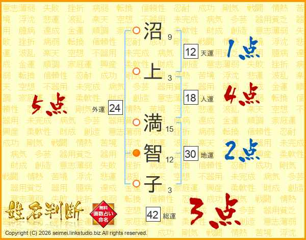 沼(9画)上(3画) 満(15画)智(12画)子(3画)