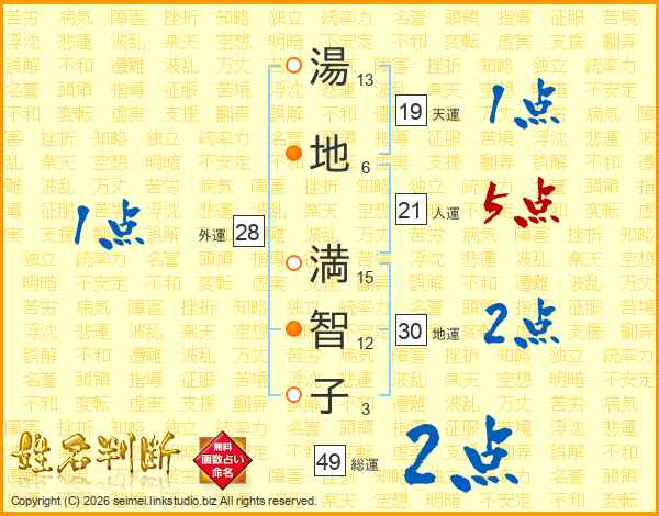 湯(13画)地(6画) 満(15画)智(12画)子(3画)