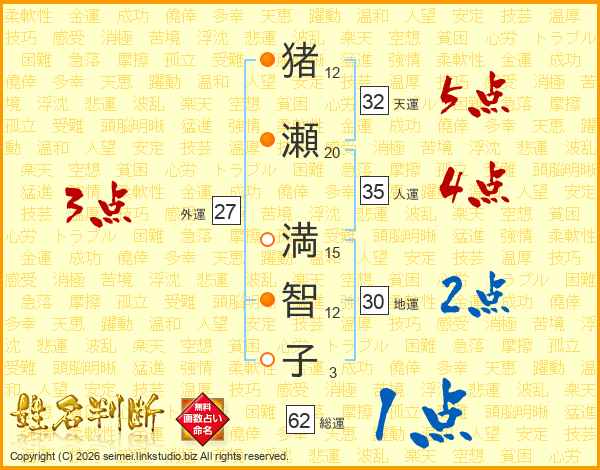 猪(12画)瀬(20画) 満(15画)智(12画)子(3画)