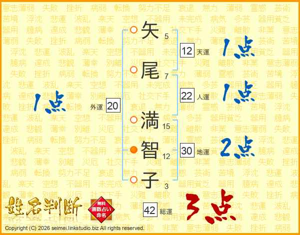 矢(5画)尾(7画) 満(15画)智(12画)子(3画)
