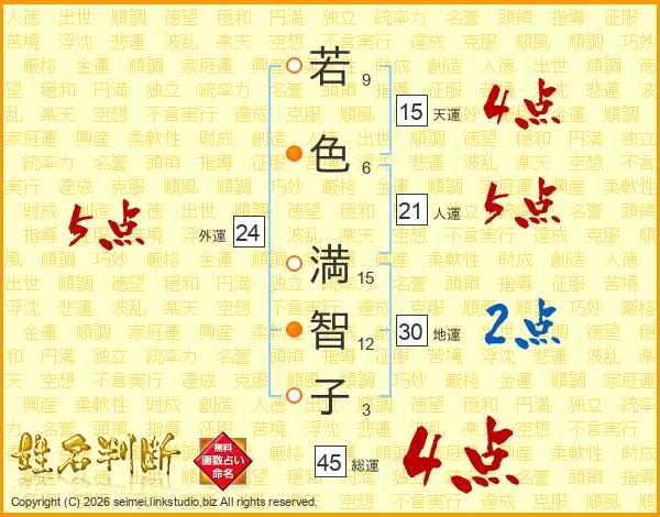 若(9画)色(6画) 満(15画)智(12画)子(3画)