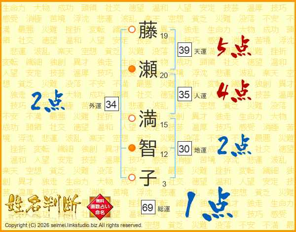 藤(19画)瀬(20画) 満(15画)智(12画)子(3画)