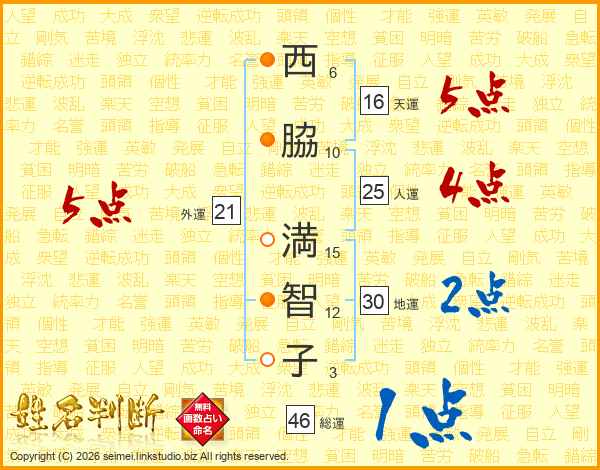 西(6画)脇(10画) 満(15画)智(12画)子(3画)