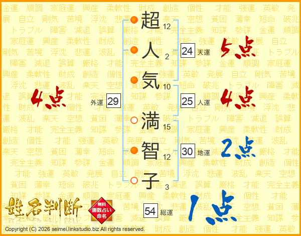 超(12画)人(2画)気(10画) 満(15画)智(12画)子(3画)