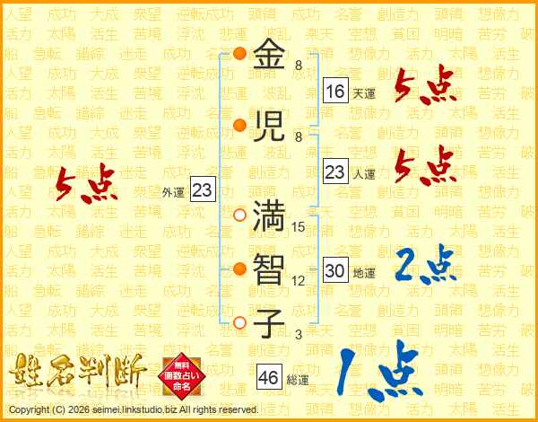金(8画)児(8画) 満(15画)智(12画)子(3画)