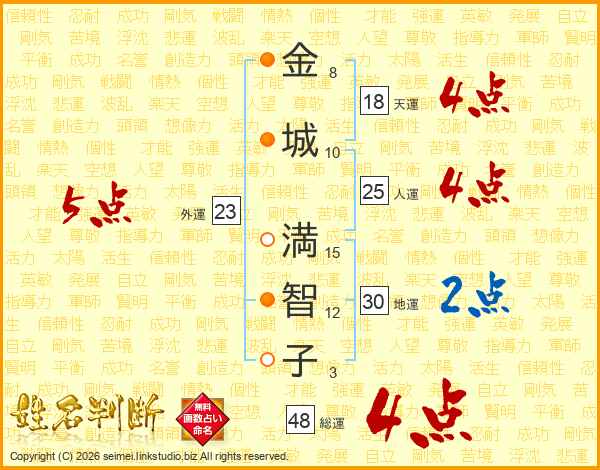 金(8画)城(10画) 満(15画)智(12画)子(3画)