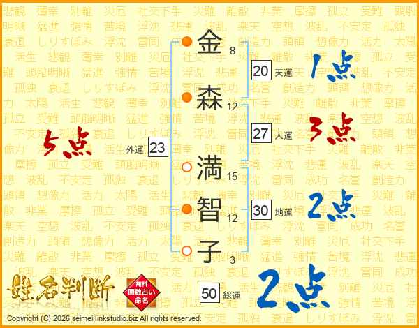 金(8画)森(12画) 満(15画)智(12画)子(3画)