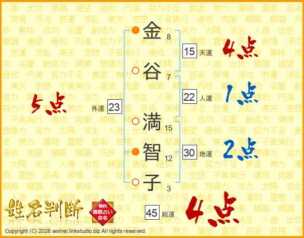 金(8画)谷(7画) 満(15画)智(12画)子(3画)