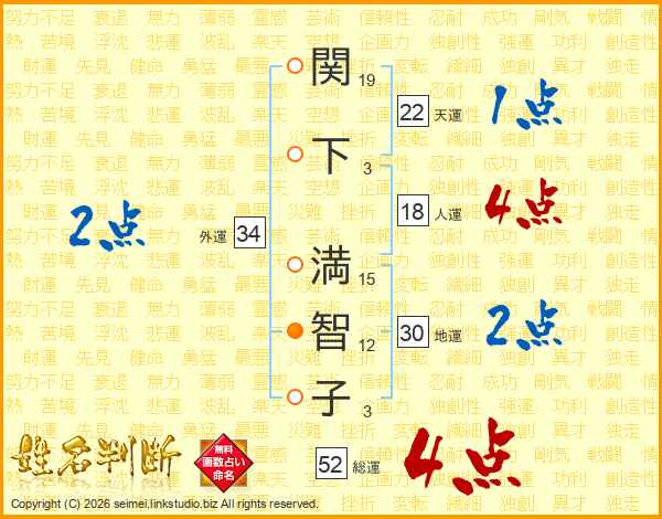 関(19画)下(3画) 満(15画)智(12画)子(3画)