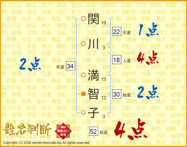 関(19画)川(3画) 満(15画)智(12画)子(3画)