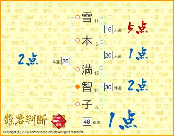 雪(11画)本(5画) 満(15画)智(12画)子(3画)