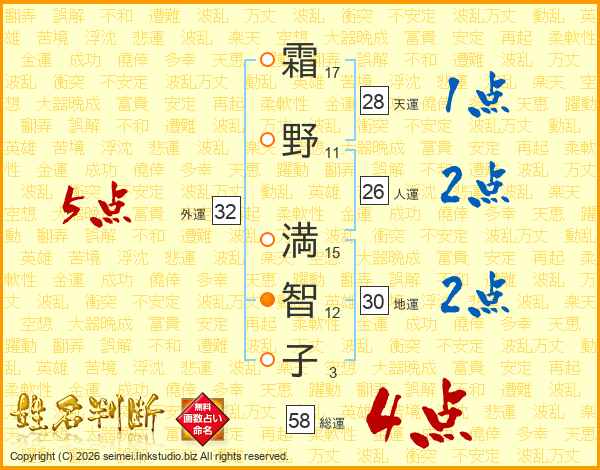 霜(17画)野(11画) 満(15画)智(12画)子(3画)