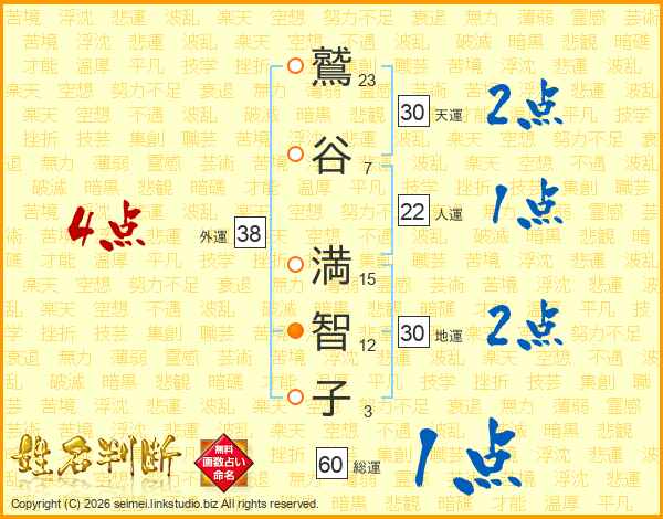 鷲(23画)谷(7画) 満(15画)智(12画)子(3画)