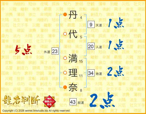 丹(4画)代(5画) 満(15画)理(11画)奈(8画)