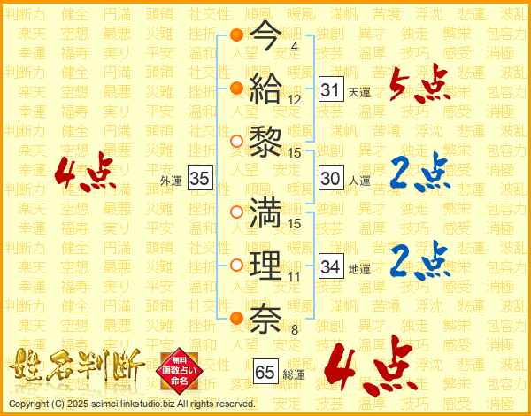 今(4画)給(12画)黎(15画) 満(15画)理(11画)奈(8画)