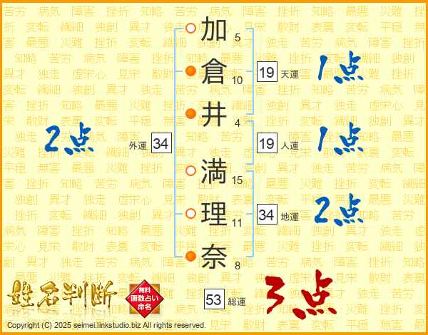 加(5画)倉(10画)井(4画) 満(15画)理(11画)奈(8画)