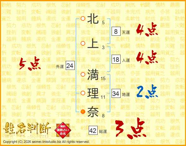 北(5画)上(3画) 満(15画)理(11画)奈(8画)