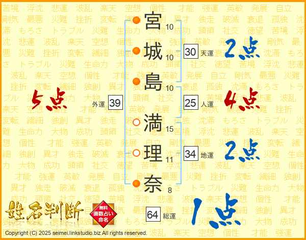 宮(10画)城(10画)島(10画) 満(15画)理(11画)奈(8画)