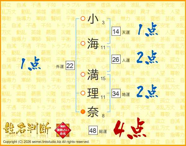 小(3画)海(11画) 満(15画)理(11画)奈(8画)