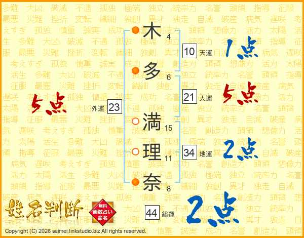 木(4画)多(6画) 満(15画)理(11画)奈(8画)