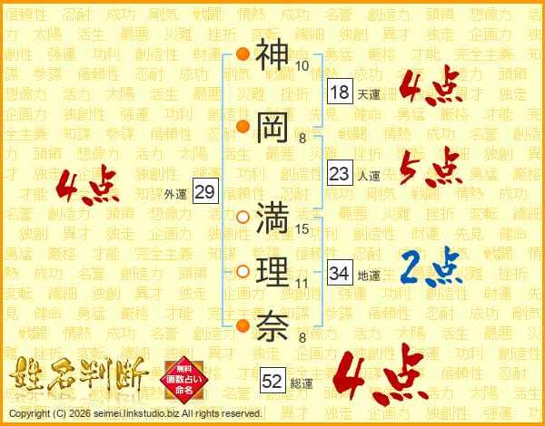 神(10画)岡(8画) 満(15画)理(11画)奈(8画)
