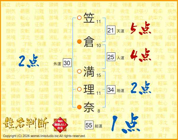 笠(11画)倉(10画) 満(15画)理(11画)奈(8画)