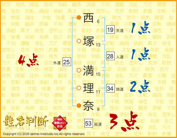 西(6画)塚(13画) 満(15画)理(11画)奈(8画)