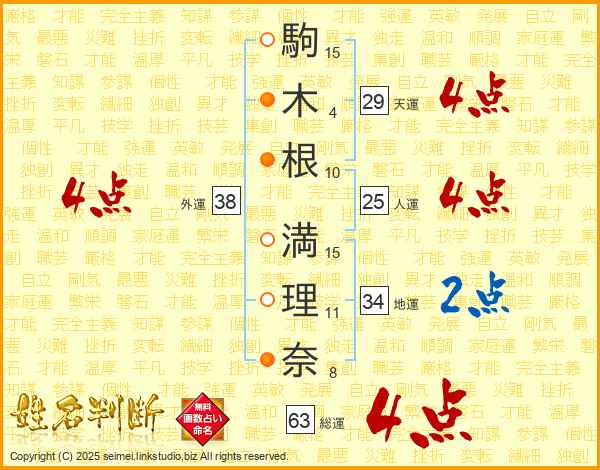 駒(15画)木(4画)根(10画) 満(15画)理(11画)奈(8画)
