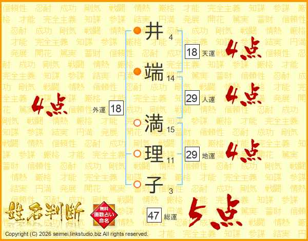 井(4画)端(14画) 満(15画)理(11画)子(3画)