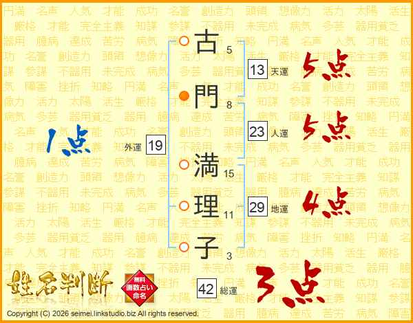 古(5画)門(8画) 満(15画)理(11画)子(3画)