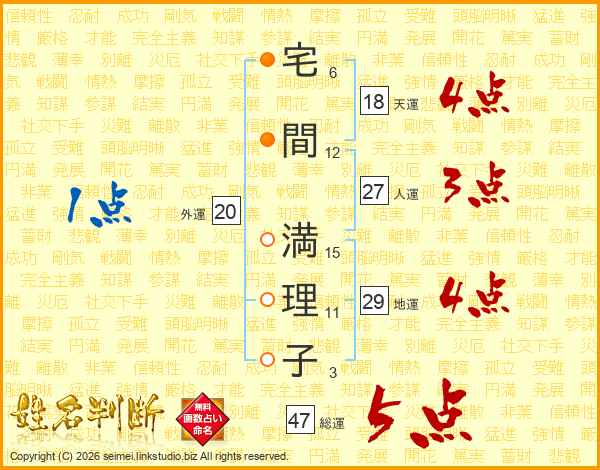 宅(6画)間(12画) 満(15画)理(11画)子(3画)