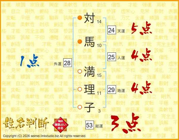 対(14画)馬(10画) 満(15画)理(11画)子(3画)