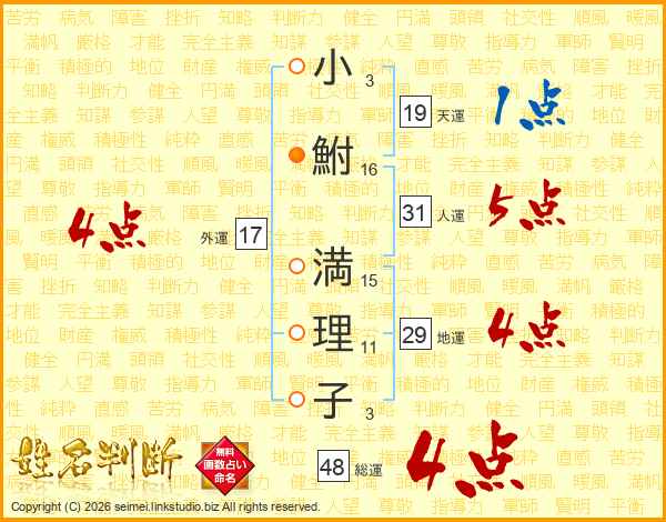 小(3画)鮒(16画) 満(15画)理(11画)子(3画)
