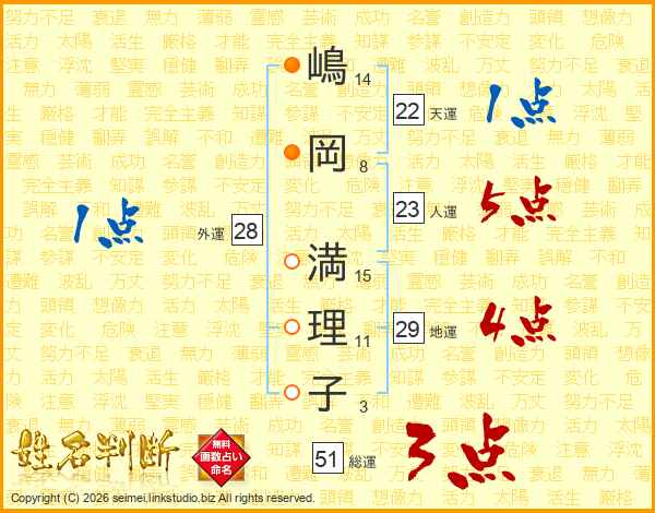 嶋(14画)岡(8画) 満(15画)理(11画)子(3画)