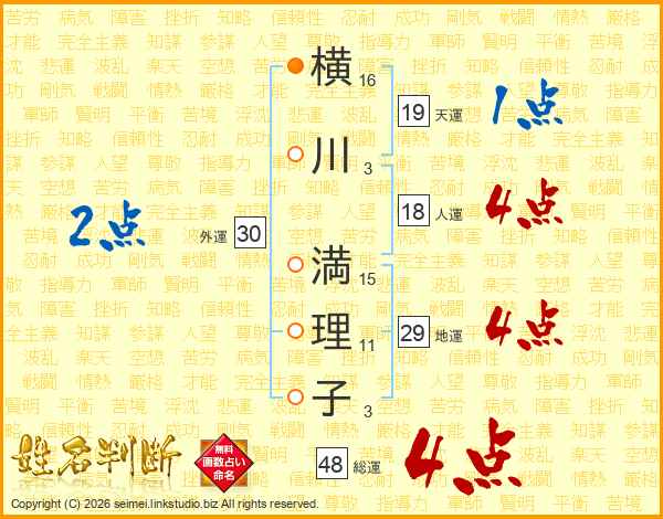 横(16画)川(3画) 満(15画)理(11画)子(3画)