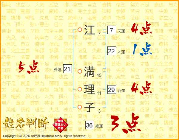 江(7画) 満(15画)理(11画)子(3画)
