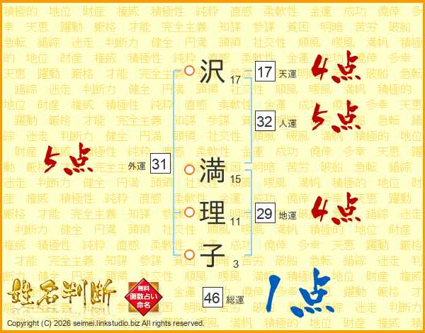 沢(17画) 満(15画)理(11画)子(3画)