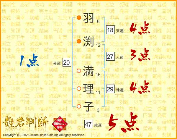 羽(6画)渕(12画) 満(15画)理(11画)子(3画)