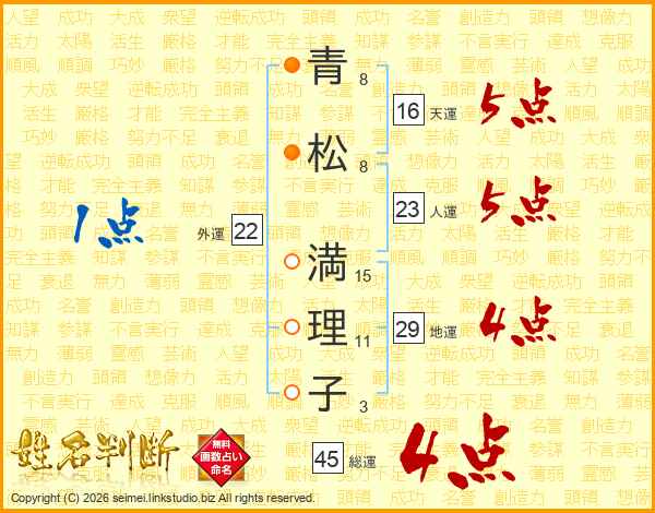 青(8画)松(8画) 満(15画)理(11画)子(3画)