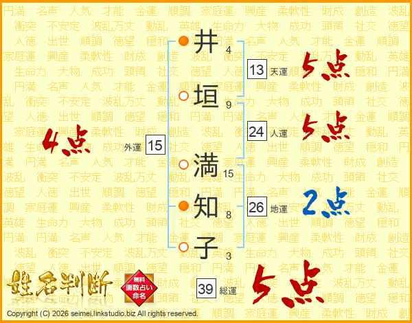 井(4画)垣(9画) 満(15画)知(8画)子(3画)