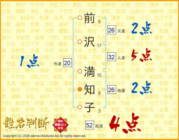 前(9画)沢(17画) 満(15画)知(8画)子(3画)