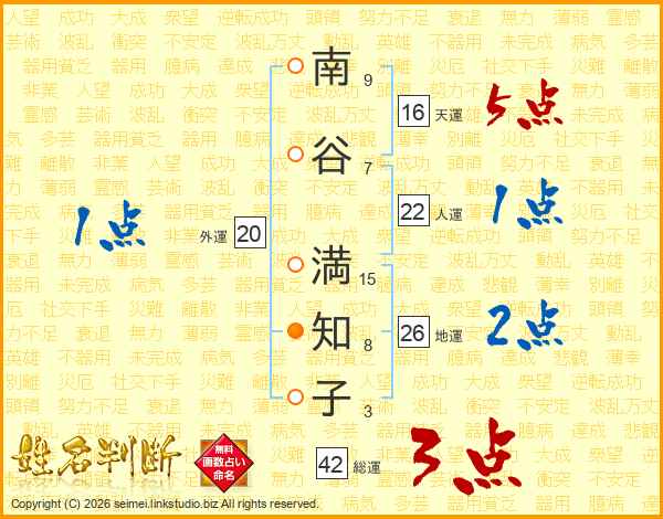 南(9画)谷(7画) 満(15画)知(8画)子(3画)