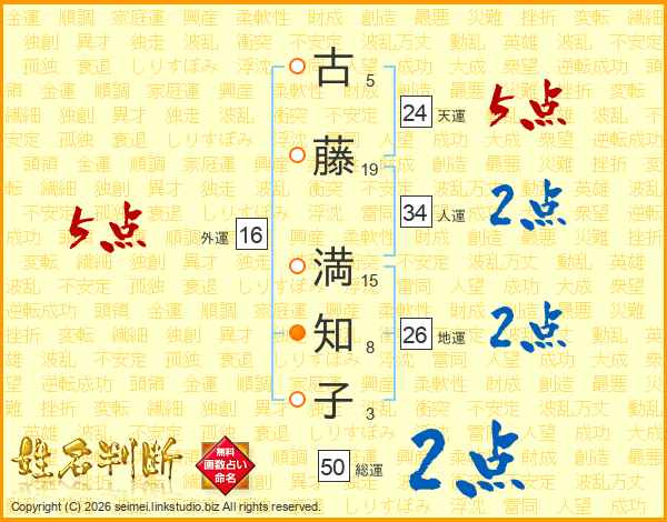 古(5画)藤(19画) 満(15画)知(8画)子(3画)