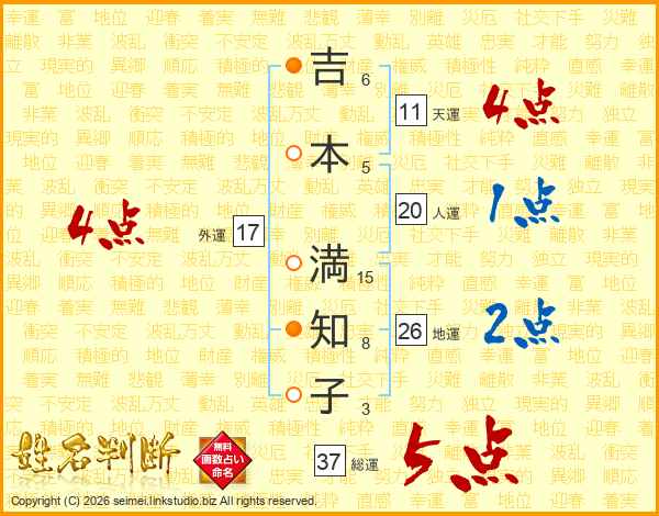 吉(6画)本(5画) 満(15画)知(8画)子(3画)